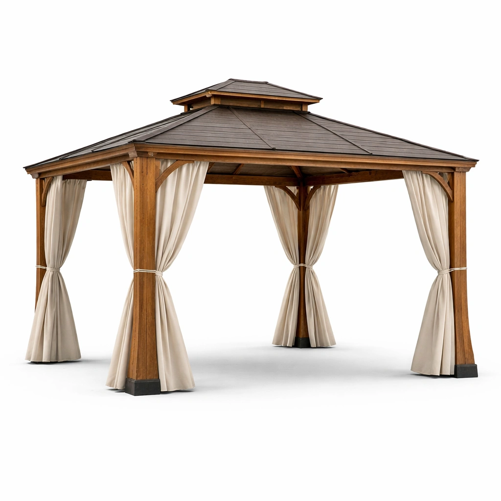Gazebo de jardín con estructura de madera y techo metálico