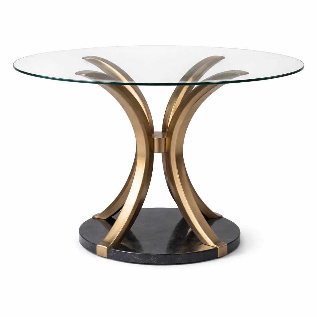 Material: Superficie de vidrio templado de 10 mm, estructura de metal con acabado dorado, base de mármol negro.